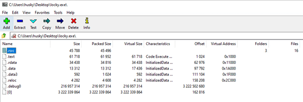 Examining the results, we can see that there are three sections identified as packed by DIE, though no obvious information about what packer might have been used. To attempt to go deeper, I ran the malware through Universal Extractor, which threw an error indicating that the malware might contain a 7z archive (annoying, but a vital piece of information in the puzzle). Moving over to 7zip, I opened the executable file and found the contents: