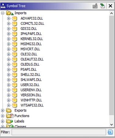 Taking the unpacked malware, I threw the contents into Ghidra to attempt to get a better idea of what it might do. Specifically, I took a look at the imports table to try and get an idea of what functions the sample was importing from Windows libraries. Below are the results: the malware imports the DLLs ADVAPI32, COMCTL32, GDI32, IPHLPAPI, KERNEL32, MSIMG32, MSVCRT, OLE32, OLEAUT32, OLEDLG, PSAPI, SHELL32, SHLWAPI, USER32, USERENV, VERSION, WINHTTP, and WTSAPI32.