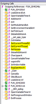 Continuing the analysis, I had a look over the functions that Ghidra had built out while decompiling the malware. There is one particular function, “FUN_0040246c”, that appears to contain the main functions of the malware. This function takes the output of “FUN_00402a5f”, itself started by the “entry” function, as shown below. The outgoing calls from this function (bottom picture) seem to handle examining the system the malware is running on (tGetCurrentThread, GetVersion, RegOpenKeyW etc.).